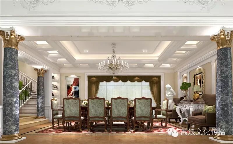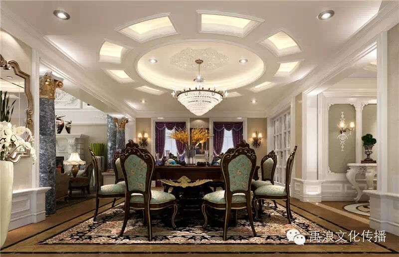 本案将欧式风格和田园风格相结合,以华美精致为设计基调,以大气而不乏细腻的雕琢,使欧洲古典主义气息弥漫其中。从简单到繁杂、从整体到局部,精雕细琢的设计传达出别墅主人高贵的身份和对雅致的生活品味的追求。大面积的透明窗设置使阳光和空气恣意倾入室内,形成敞亮的空间光环境。墙面采用竖向的线条构图,干净洗练,强化了空间骨架的纯粹感,木质雕花的墙面装饰透出华美贵气的韵律,整体端庄而优雅。顶棚的巨型水晶吊灯充满欧洲宫廷气息,璀璨的灯光带来雍容高贵之感。构图简洁,色彩低调,能使人很强烈地感受传统的历史痕迹与浑厚的文化底蕴。同时又摒弃了过于复杂的肌理和装饰,干净利落的线条和组织严谨的空间构造使整体空间显得高旷宏大、开阔而具灵韵;并将室内雕刻工艺运用在装饰和陈设艺术上,那温暖的色调和精美的装饰造型于细微之处见出功底,镶边雕花的家具与水晶材质的配饰一丝不苟,而沙发采用经典的欧式造型,黑色与深棕色的皮质极为协调,尽显唯美与优雅的姿态,打造总体华美而内敛的氛围,把欧洲别样的风情魅力表现淋漓尽致……